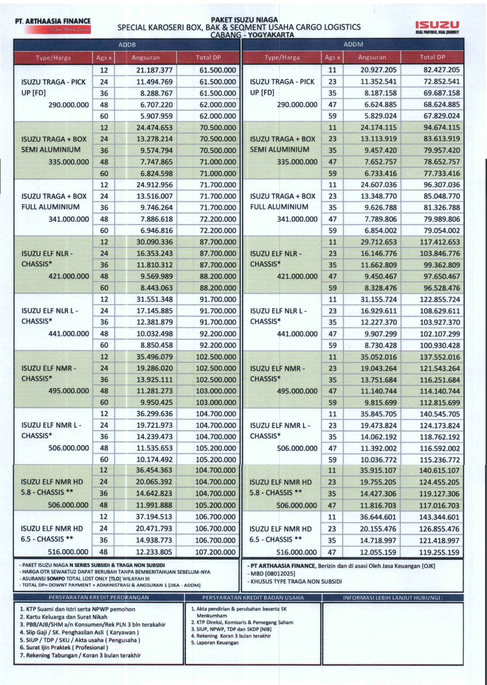 Kami menawarkan berbagai pilihan paket kredit Isuzu 2025 untuk Traga, ELF, GIGA, dan model lainnya, dengan tenor hingga 5-6 tahun.